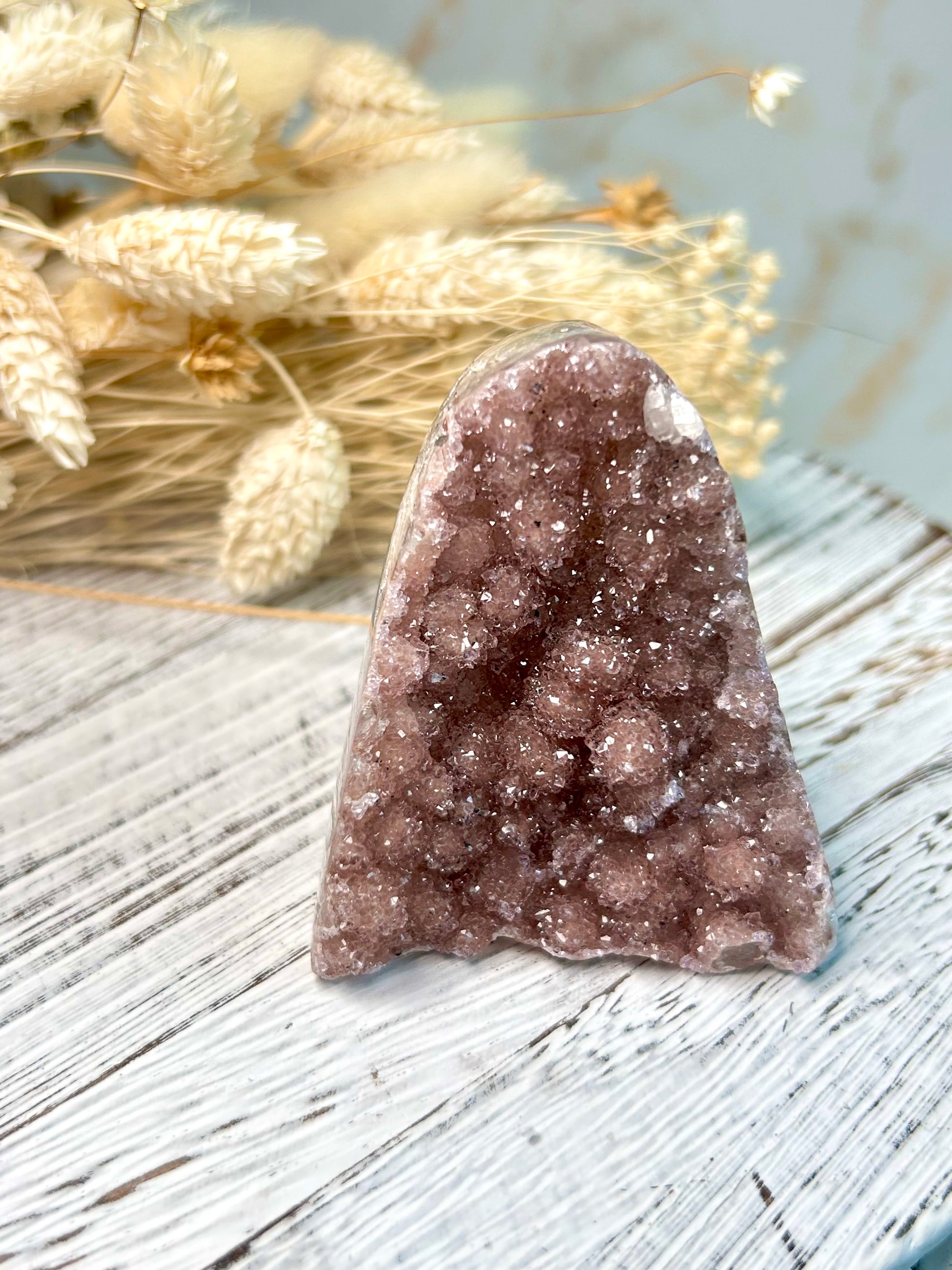 A classic Uruguayan Amethyst cut base with rich, saturated violet points and a natural quartz edge that glimmers in soft light. Each facet captures depth and sparkle, revealing layers of crystalline growth frozen in time. The flat base allows it to stand beautifully on shelves, altars, or bedside tables — perfect for adding a calm, luminous energy to any space.