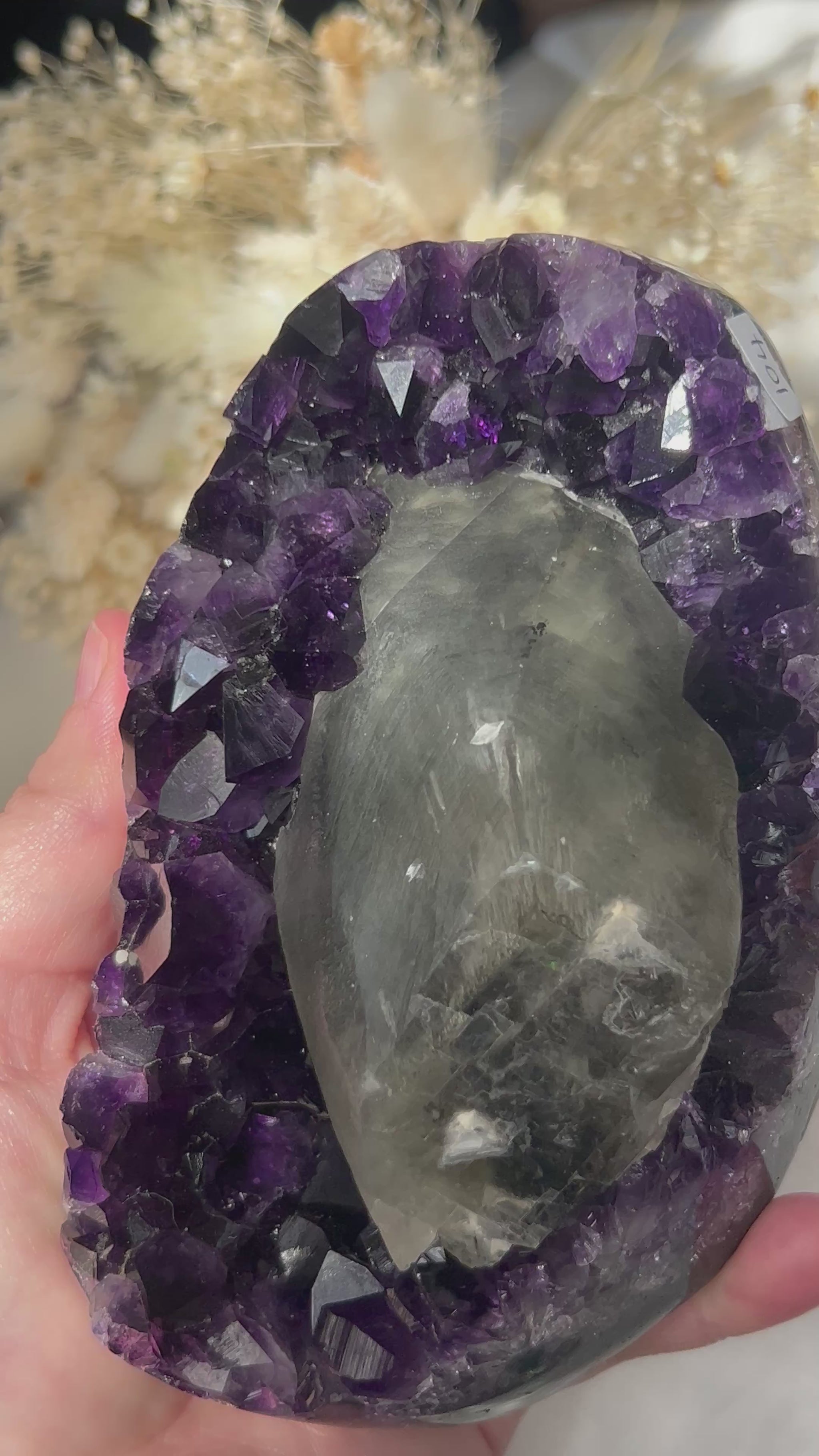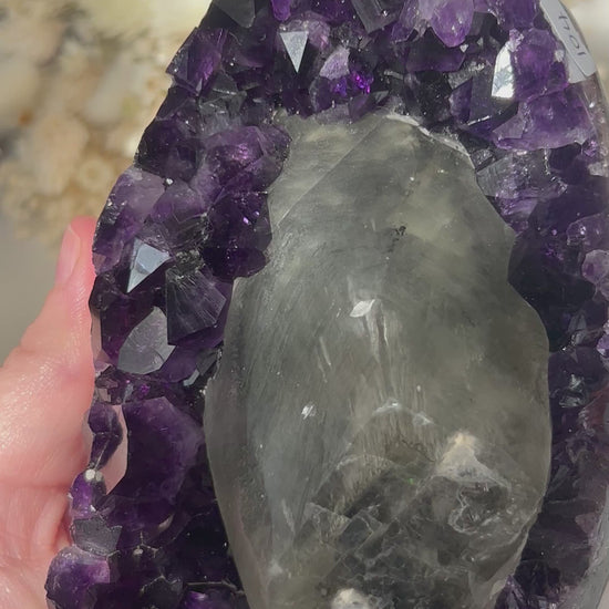 A naturally sculpted marvel of contrast and harmony, this Uruguayan Amethyst geode holds a Calcite heart at its centre—cradled in a sea of deep violet crystal points. The intensity of the Amethyst forms a rich, gemmy border, while the Calcite glows with a soft, ethereal sheen, like moonlight captured in stone.