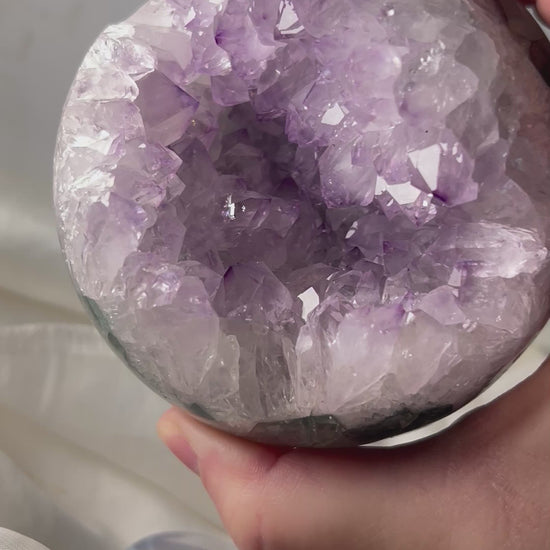 This extraordinary Amethyst sphere displays vibrant lavender and violet crystal points, layered with intriguing natural green mineral inclusions at its base. The contrast between soft lilac translucence and earthy depth gives this piece its captivating duality — ethereal yet grounded.