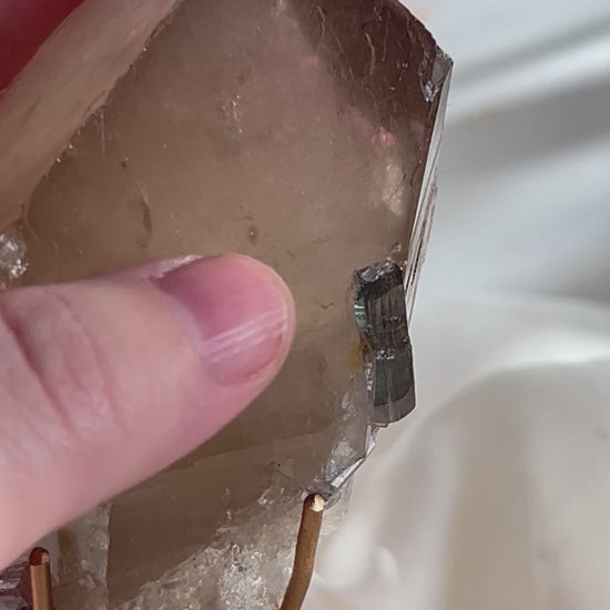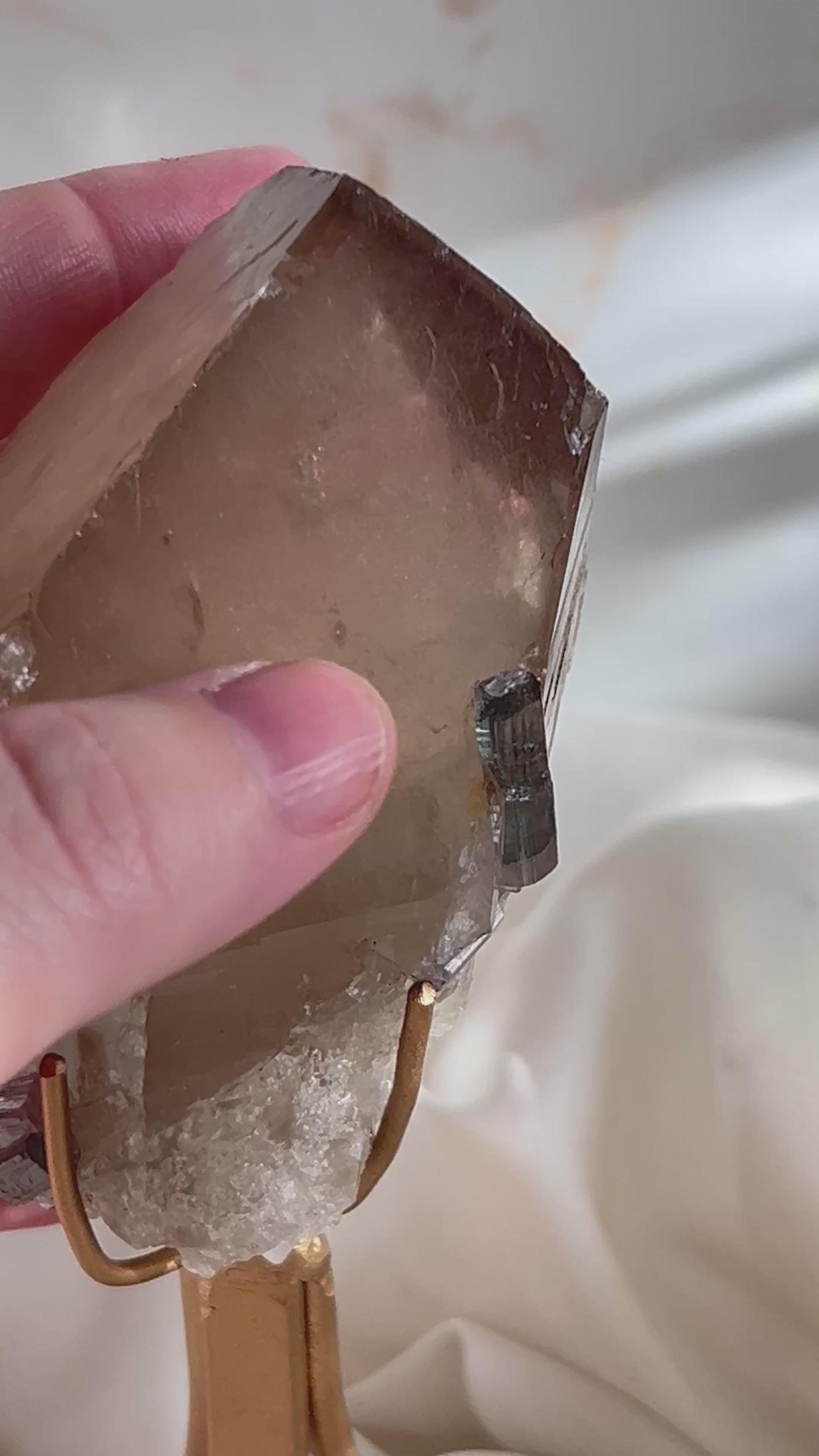 A rare and captivating combination, this Brazilian Citrine displays exceptional clarity with a striking embedded Tourmaline crystal. The golden tones glow warmly through the quartz, while the dark, glassy inclusion creates a stunning contrast, giving this piece both visual depth and energetic balance.