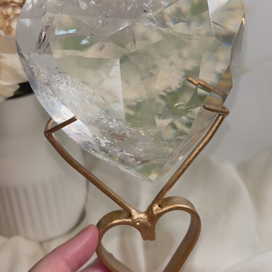 A beautifully cut faceted clear quartz crystal presented on an elegant display stand. The carefully shaped geometric facets catch and reflect light from every angle, creating flashes of brilliance that highlight the natural clarity of quartz.
