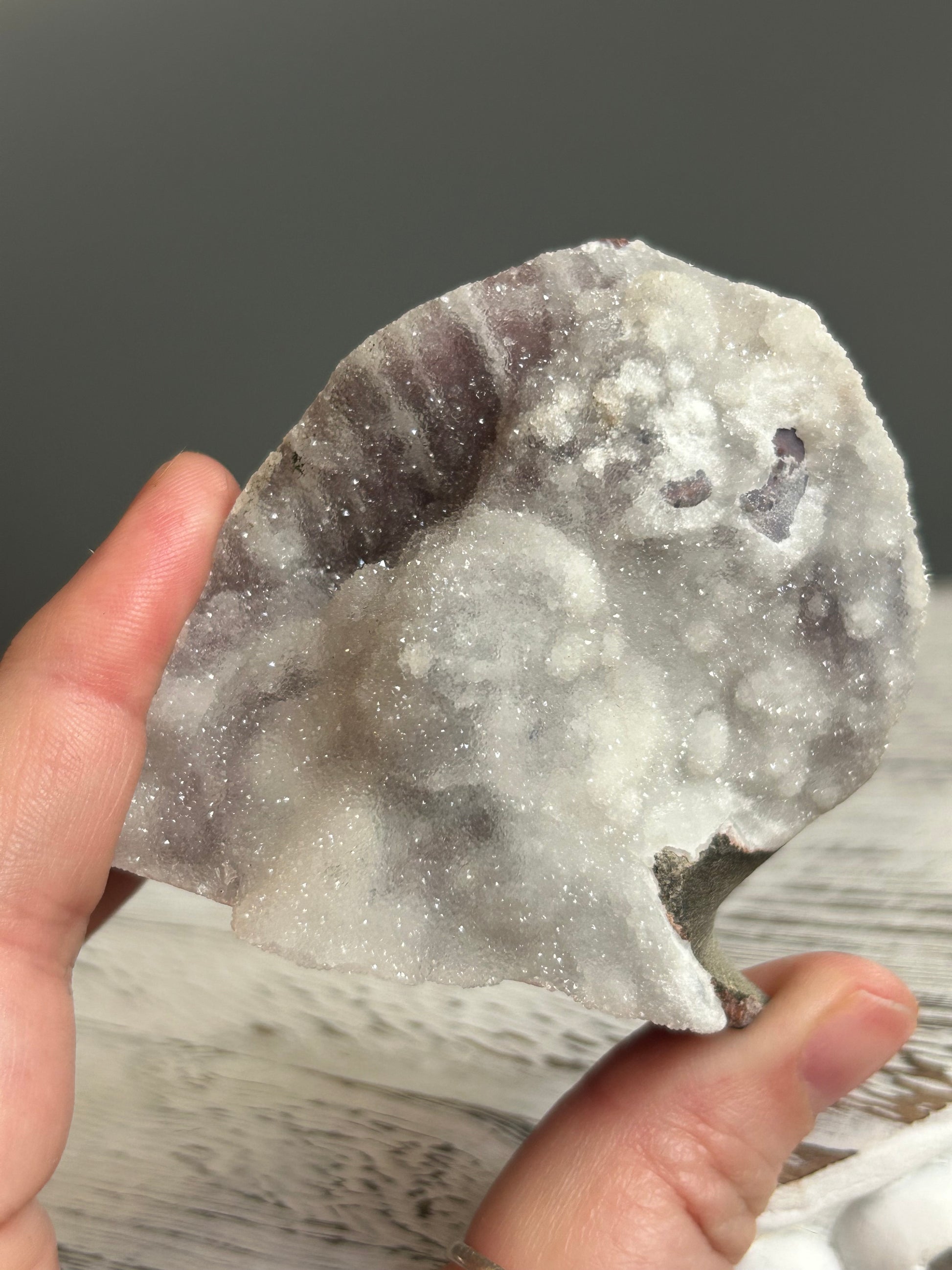These Grey Chalcedony specimens come from the Pune District in Maharashtra, India. Each piece shows a soft grey surface tone with delicate lavender, pink, and mauve hues layered beneath the crystal growth. These subtle colour shifts create a dreamy, ethereal effect that sets them apart from typical chalcedony formations.