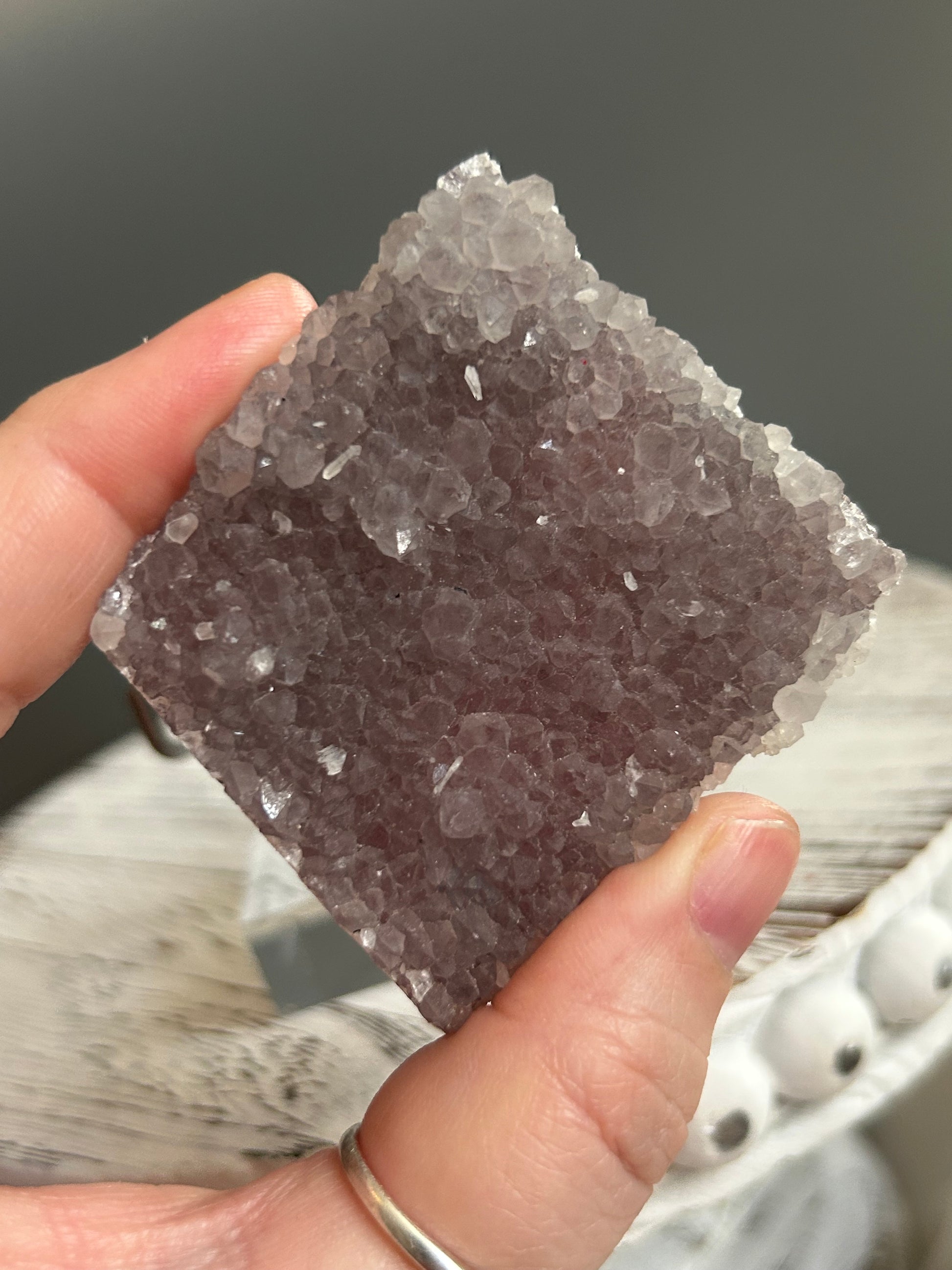 These Grey Chalcedony specimens come from the Pune District in Maharashtra, India. Each piece shows a soft grey surface tone with delicate lavender, pink, and mauve hues layered beneath the crystal growth. These subtle colour shifts create a dreamy, ethereal effect that sets them apart from typical chalcedony formations.
