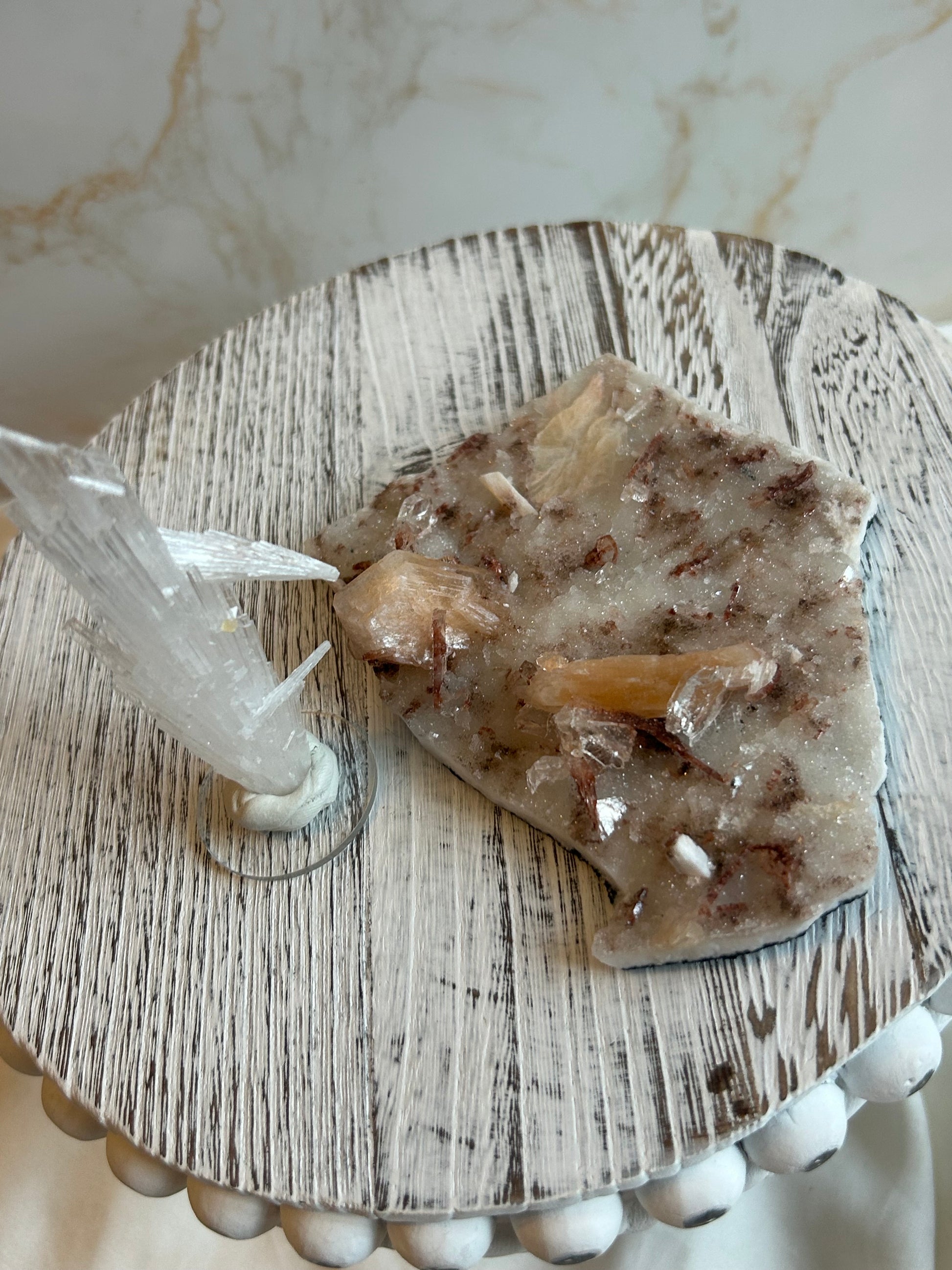 Rare red- clear Apophyllite with Stilbite on sparkling white Chalcedony C36