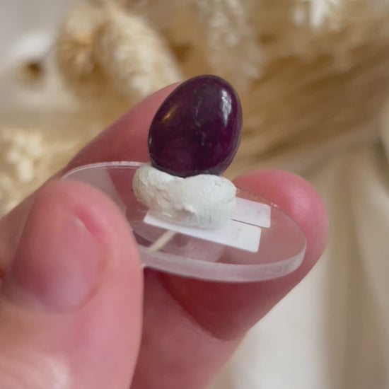 This vivid Ruby cabochon radiates with deep magenta-red tones, alive with warmth and quiet intensity. Each polished gem carries its own story within the colour m, a balance of passion and peace, of strength softened by compassion.