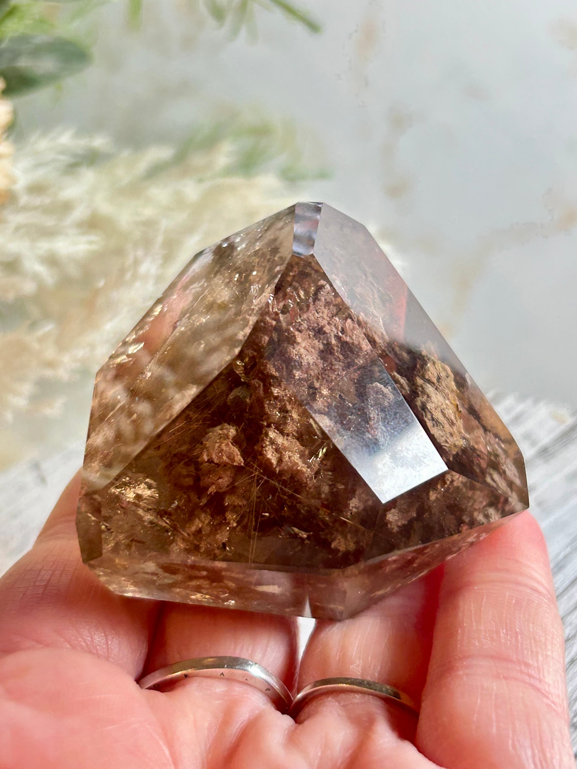 Lodolite (also known as Garden Quartz) is prized for its internal “worlds,” and this piece is especially textural. The dense mineral inclusions create depth and movement, while delicate rutile strands catch the light, adding subtle golden flashes throughout the stone.