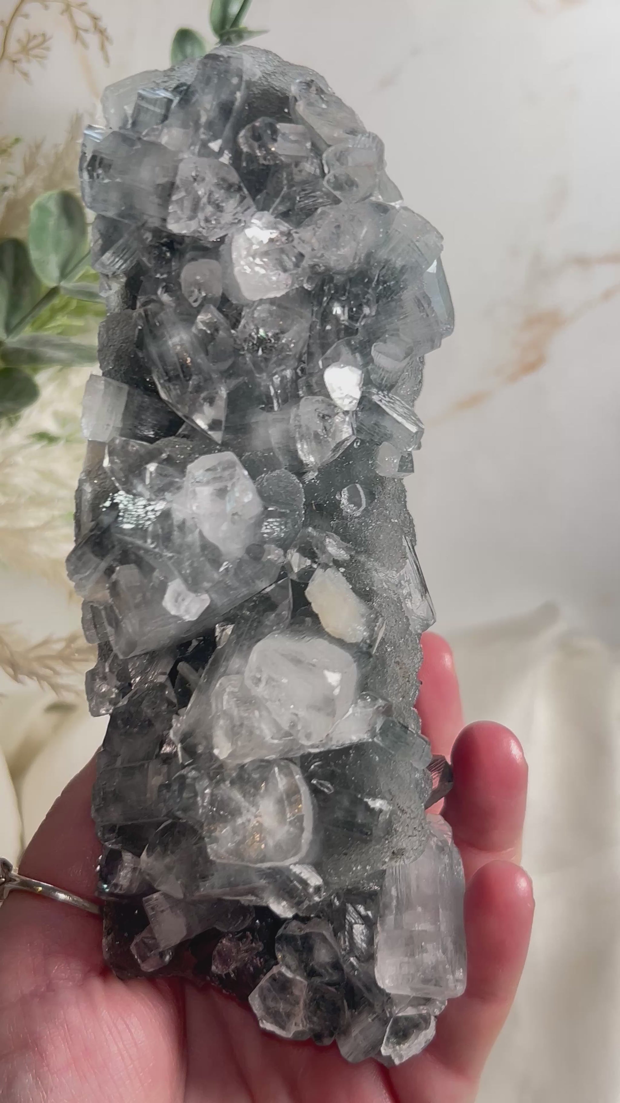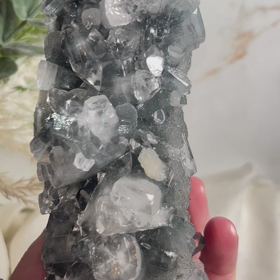 Clear, light-catching apophyllite points rise from a soft, silvery-grey chalcedony base that carries a subtle, almost mist-like glow. The contrast between sparkle and softness gives each piece a refined presence, striking without being overwhelming.