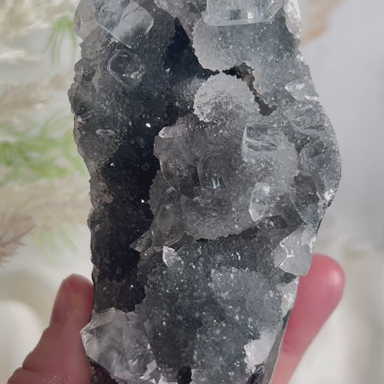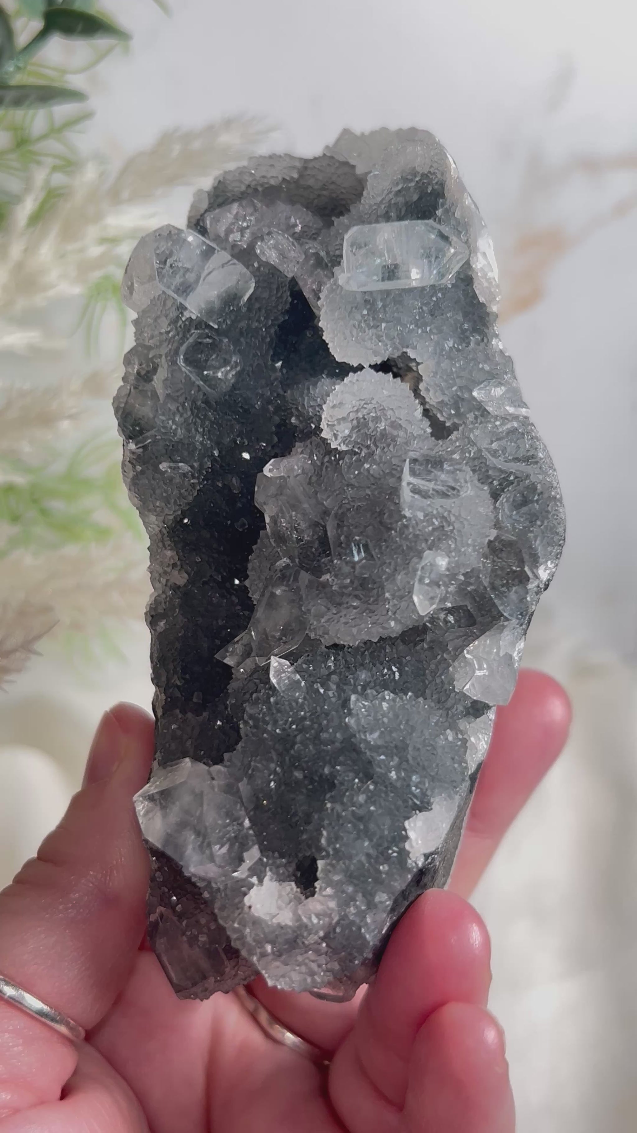 Clear, light-catching apophyllite points rise from a soft, silvery-grey chalcedony base that carries a subtle, almost mist-like glow. The contrast between sparkle and softness gives each piece a refined presence, striking without being overwhelming.